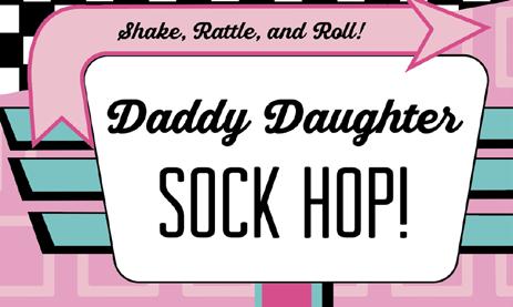 A Daddy Daughter Dance, two time slots available. Limit of 150 people per timeslot. Light refreshments will be served. $25/couple, $10/additional child(ren).