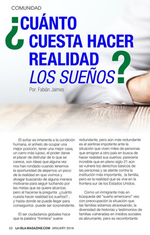 El soñar es inherente a la condición humana, el anhelo de ocupar una mejor posición, tener una mejor casa, un carro más lujoso, el poder darse el placer de disfrutar de lo que se carece, son ideas que alguna vez nos han rondado cuando tenemos la oportunidad de alejarnos un poco de la realidad en que vivimos y divagar buscando de alguna manera motivarse para seguir luchando por las metas que se quiere alcanzar, pero al hacerse la pregunta ¿cuánto cuesta hacer realidad los sueños? , y hasta donde se puede llegar para conseguirlos puede ser sorprendente. El ser ciudadanos globales hace que la palabra “frontera” suene 22 LA ISLA MAGAZINE.COM JANUARY 2019