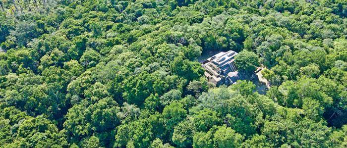 Con una antigüedad de al menos 2 mil 400 años, el conjunto central abarca una superficie de siete hectáreas, superior a las casi cinco que ocupa el Zócalo de la Ciudad de México. Las estructuras, recubiertas aún por la vegetación en varias de sus caras, congregan en sus orillas el verde selvático y la piedra ennegrecida por el tiempo y la intemperie. El silencio de la plaza central es roto en ocasiones por la estridencia de un tucán o un faisán.