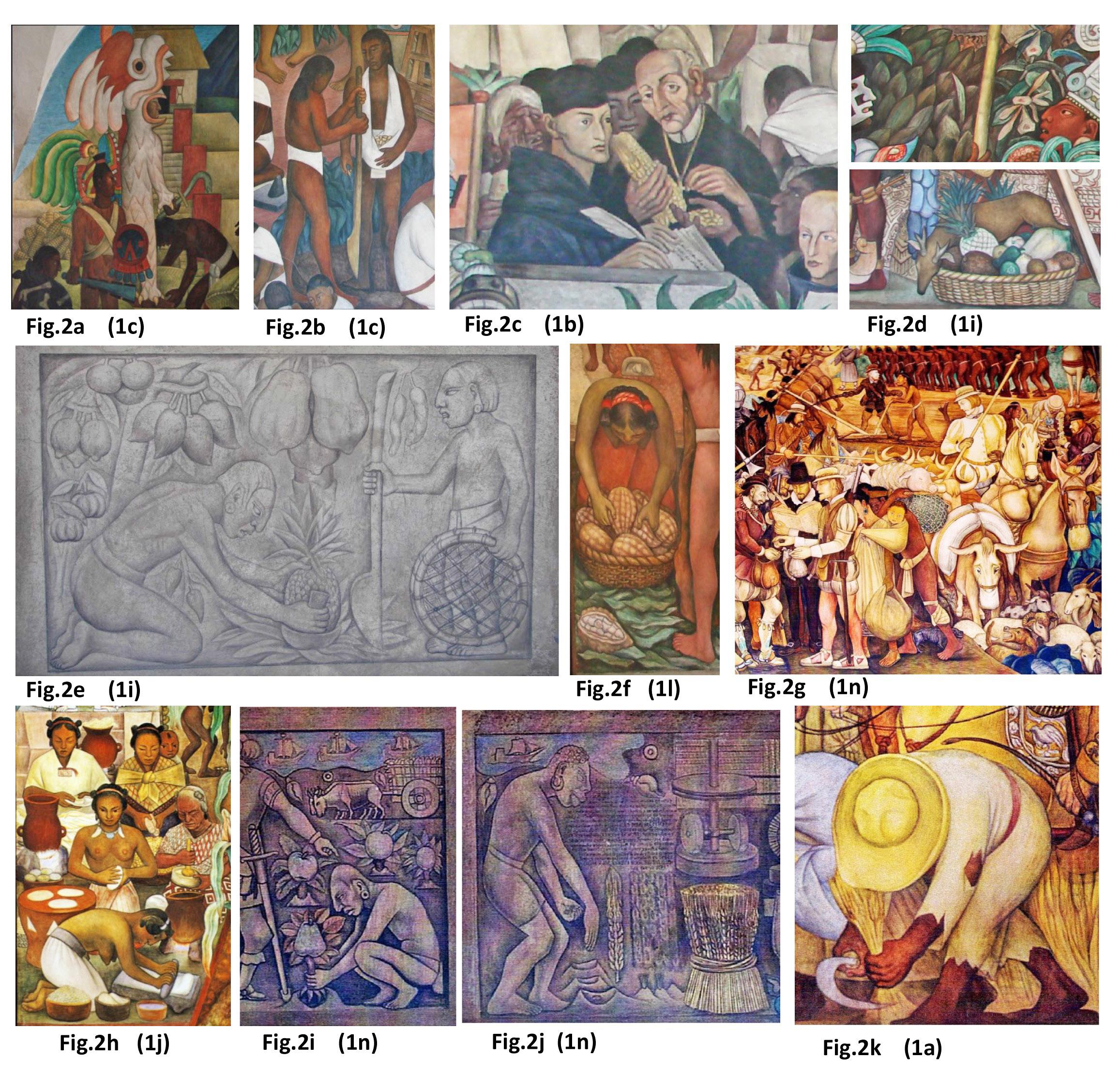El pintor se basó en fuentes históricas, arqueológicas, etnográficas y artísticas para dar veracidad a sus composiciones, reflejando tanto información antigua como contemporánea. Inspirado por historiadores y científicos, destacó la alimentación como un tema recurrente, utilizando productos como el maíz, el pulque, la vainilla, el nopal y el cacao para reforzar la identidad mexicana. Nuestro artista utilizó códices indígenas, crónicas coloniales, estudios y piezas arqueológicas para representar la vida cotidiana de las sociedades antiguas y sus sistemas productivos. En murales como “Cultura totonaca” y “La cultura huasteca (el maíz)”, destacó la importancia de los alimentos y su papel en la idiosincrasia de estas civilizaciones. El origen del maíz fue objeto de intenso estudio y debate internacional, y el pintor celebró su invención y domesticación en Mesoamérica. Rivera presentó una convivencia multicultural que unifica a los pueblos de México, destacando la diversidad y originalidad de productos, técnicas y prácticas tradicionales. En murales como “El hule, corte y ordeña” y “El cacao, las vainas y la almendra”, exaltó los beneficios del hule y el cacao para el mundo moderno, mostrando cómo el conocimiento milenario maya seguía vigente en el siglo XX. Las imágenes del pasado prehispánico en los murales de nuestro artista están profundamente arraigadas en el subconsciente colectivo mexicano. Estas representaciones invitan a reflexionar sobre la an-