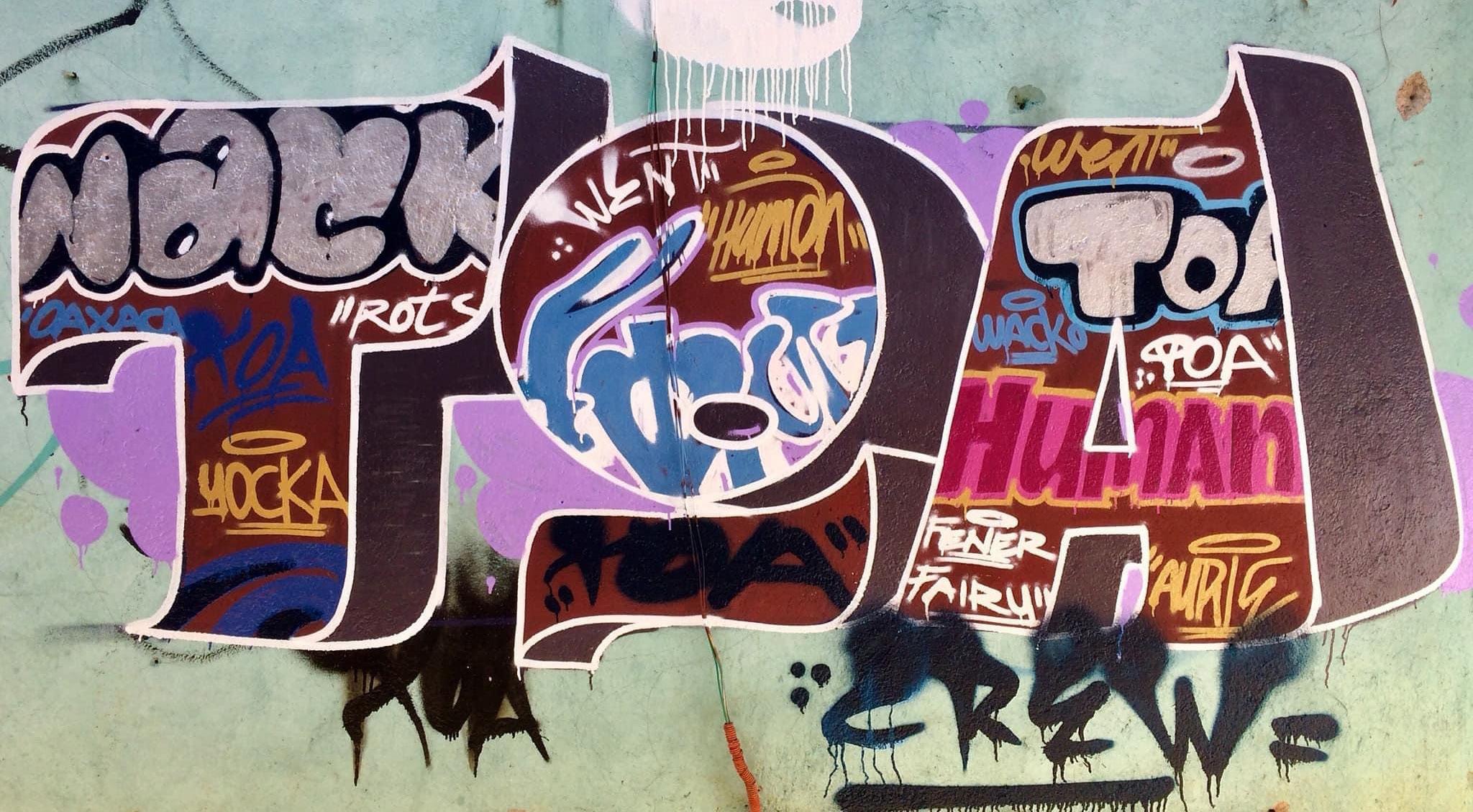 El crew TOA nació en el oriente de la CDMX en Valle de Chalco a mediados de los años noventas, la Avenida Zaragoza, Ermita Iztapalapa y la Autopista México-Puebla, eran las principales avenidas donde se manifestaban. Actualmente, son aproximadamente 25 integrantes y como 10 están en activo, uno de sus más antiguos integrantes, Cuko, fue el realizador del video de Movimiento Nacional Grafiti I y II que se distribuyó en video VHS hace ya algunos años y que ahora está disponible en YouTube. NEZIA desde finales de los 90s, le da al grafiti y unas de sus influencias fueron los Puro Estilo Callejero (PEC), CH, SF, y de la CK le gustaban sus wildstyle. Ella tiene pintas en trenes que es lo que más le apasiona y sus obras han llegado a los Estados Unidos y Canadá. En sus inicios, incluso estuvo a punto de irse al Consejo Tutelar por una pinta que hizo en un autobús escolar. Cuko, la invitó a integrarse a TOA, ella también pertenece al SA . Su firma se la debe a su mamá porque siempre le decía que ella era una “necia”. Su lugar se lo fue ganando por sus pintas y como mujer, nunca tuvo obstáculos para permanecer pintando entre hombres. Otro de sus integrantes, el Roots, inició con ellos desde hace 20 años por invitación de su hermano que ya era TOA y que habitaban allá en Valle de Chalco.