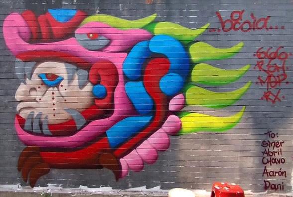 También, cerca de Tepepan había la pinta de un alíen, con su nave espacial sobrevolando la ciudad. Esa pieza era del CLON, otro pionero del sur de la ciudad y contaba con una técnica excelente para esos años. Cerca de Pantitlán y Av. Chimalhuacán había una pieza llamada el “Apocalipsis Mexica” de Gaik. La pieza jugaba con tres dimensiones. En la escena se apreciaban un par de niños dando saltos en una especie de rocas con diseños del Anáhuac. Esta pieza de los noventa marcó mi visión no solo en el Graffiti, sino también, como persona. Fue la primera vez que observé estos elementos prehispánicos en una pared. Además, llamó mucho mi atención la técnica utilizada. Y fue a partir de 1998 cuando decidí hacer Graffiti, como una manera de decir quién soy y no, y también como una forma de transmitir ideas o sentimientos. Al siguiente año, al explotar la huelga en la UNAM, abrí mis horizontes a diversas manifestaciones universitarias y artísticas como el cine y la música. Sobre esta última, la música Punk cambió completamente mi visión del mundo. Durante la Huelga se realizaban tocadas en diferentes lados para convocar a los jóvenes de la ciudad, La intención era para discutir las problemáticas sociales y buscar soluciones. En este espacio de diálogo conocí compañeros músicos, cineastas y escritores de Graffiti. Con el correr del tiempo descubrí la otra cara oculta del tag, es decir, ahora son amigos míos. Con unos, hay una colaboración activa, con otros, ya no viven en México, y otros más, ya no se encuentran con nosotros en el mismo plano astral. Tal es el caso de Yeison. Su arte de Grafiti tenía una notoria influencia hacia la cultura Underground, donde las patinetas, la música Hip-Hop, y Hard Core eran los elementos fundamentales del movimiento. Yeison era el encargado de realizar los flyer´s para las tocadas de estos géneros musicales en la Zona Oriente. En el 2005, la escena del grafiti ya era claro. Con estilos definidos por cada uno de los escritores, por ejemplo, por un lado, los más asiduos iban al Graffiti ideal, contestatario, pintando lugares públicos, atacando al sistema. Por otro lado, había crew ´ s, su obra estaba inclinada hacia el muralismo. Utilizando técnicas como el realismo, mezclando diferentes herramientas para la creación de piezas con