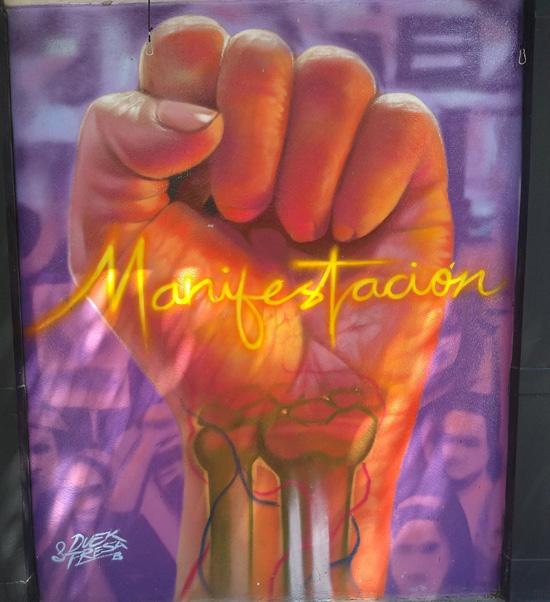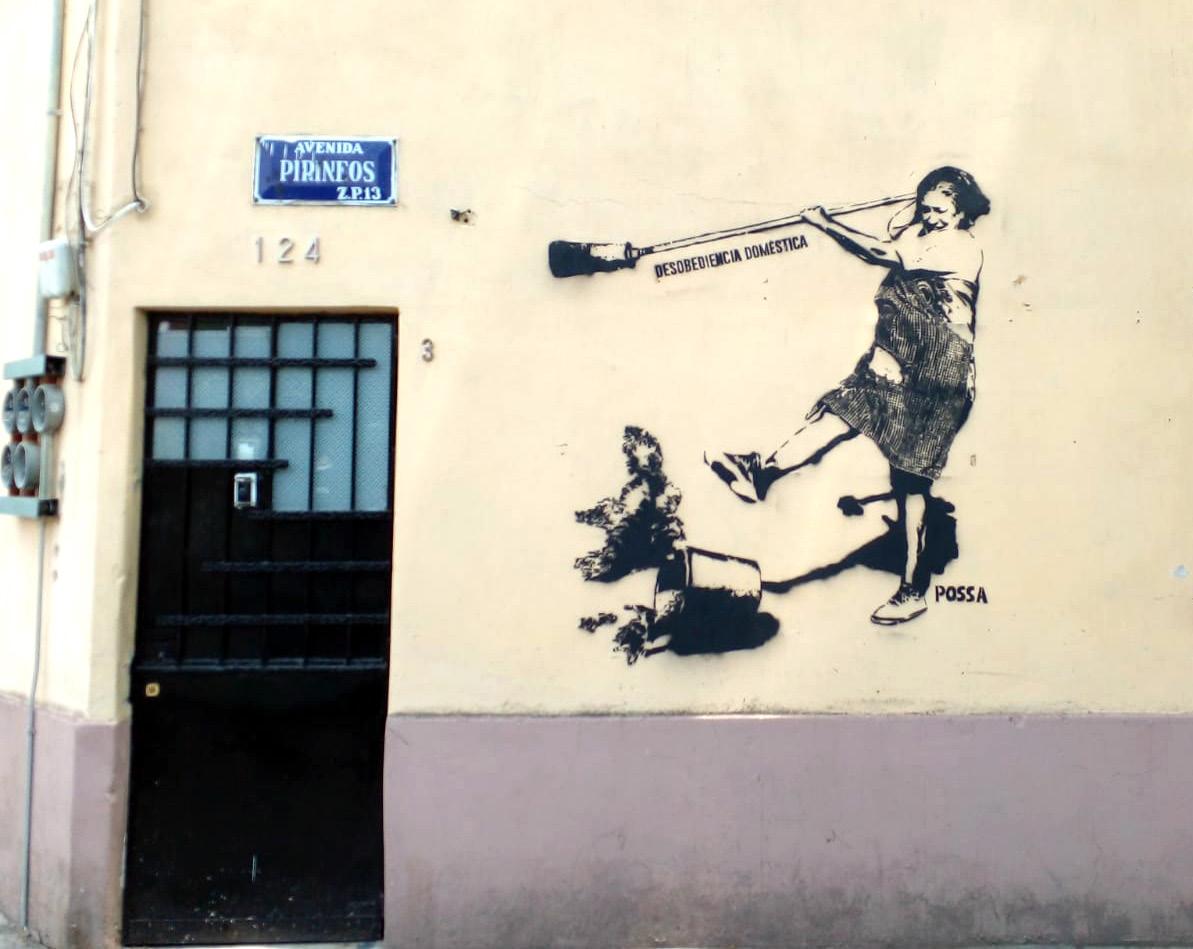 Apretando el paso rumbo a El Convite para no llegar tarde a la tocada de Héctor Infanzón, me topo en un muro de las calles de Pirineos con el grafiti de Possa titulado Desobediencia doméstica. Possa es una grafitera con rollo que combina bien imágenes con textos y la pieza que comento no le pide nada a los estarcidos de Banksy. En unos días habrá desaparecido de modo que saco mi celular y le tomo una foto.