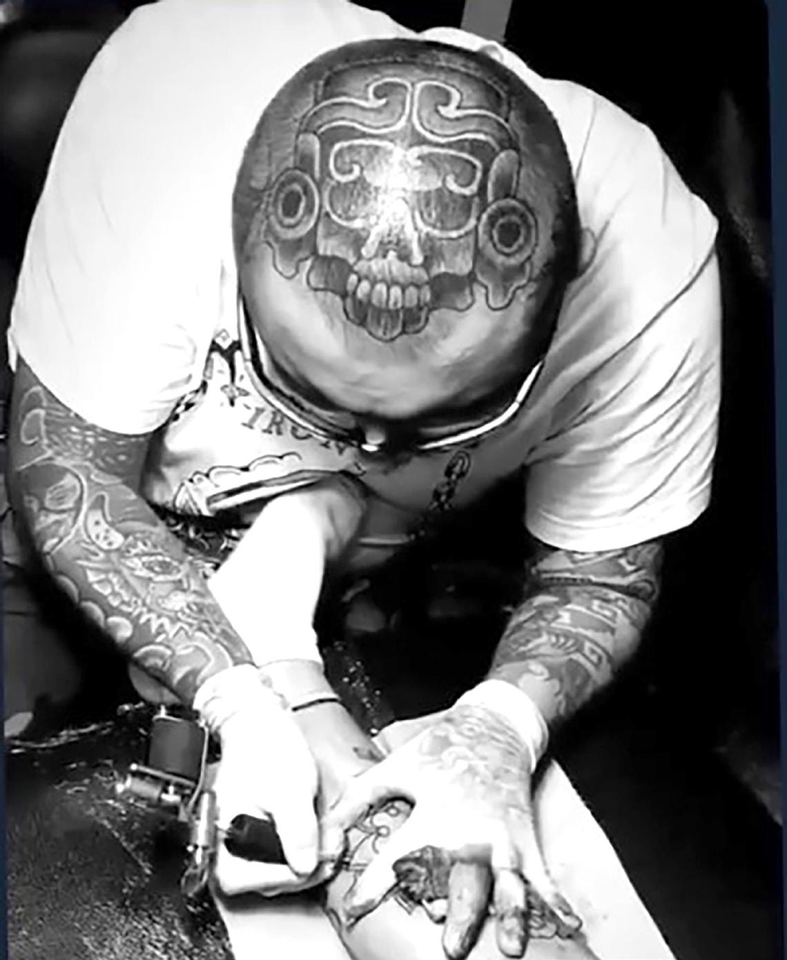 esténcil. Esta última técnica rompía con lo convencional. Con la llegada del internet y las primeras redes sociales, el Graffiti tuvo un boom de manera cibernética. Los escritores se comunicaban internacionalmente y de esta manera, logré conocer el trabajo de escritores de diferentes partes del país como: Oaxaca, Chiapas, Jalisco y Michoacán. En general, estos escritores usaban la cultura de su región para plasmarlo en su Graffiti. Con la posibilidad de viajar a otros estados, primero con el trabajo de mi papá y después, con mi banda Punk, fue lo que me permitió conectar con la cultura y las expresiones de Graffiti. Actualmente, llevo siete años como tatuador profesional, tres fueron de aprendizaje (nunca termina) y este aprendizaje, me llevó a comprender la responsabilidad, no solamente del tatuaje, sino del arte, porque yo asimilo el tatuaje como la versión de lo que es el Graffiti para mí.