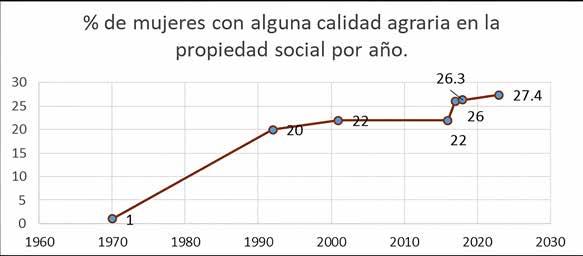 La brecha de género en la titularidad de la tierra en la propiedad social, de 1970 a 1992 disminuyó aproximadamente un punto porcentual por año. Posteriormente, hacia 2023, es decir, en tres décadas, sólo descendió otros siete puntos porcentuales.