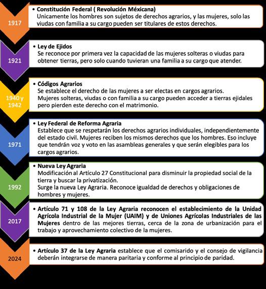 7. Marcos jurídico, institucional y social que limitan que las mujeres logren por ejemplo, la co-titularidad en la propiedad social, la prescripción positiva, o la participación en sus asambleas. La baja titularidad se debe a que no se han adecuado las leyes al marco internacional de derechos, las instituciones se rigen por la Ley Agraria de 1992, la más duradera en la materia, por lo tanto, no se adecúan a la realidad actual, y han faltado políticas públicas integrales en favor de las mujeres rurales.