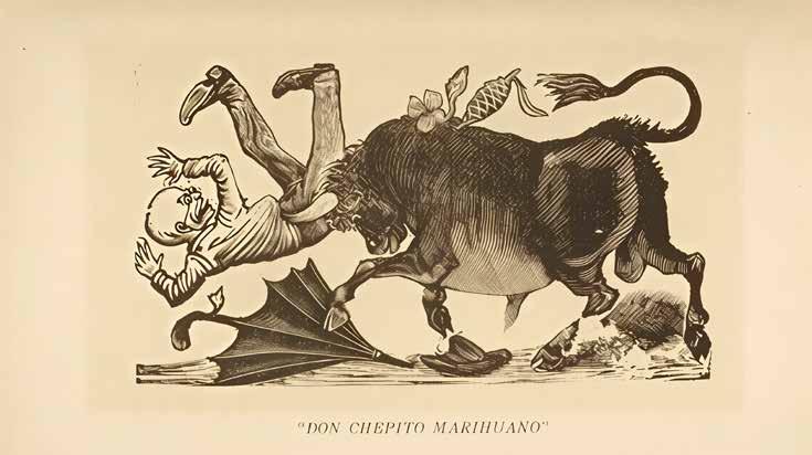 Del espléndido grabador José Guadalupe Posada que vivió y trabajó en el mero centro de la ciudad de México entre 1887 y 1913 se dice que gustaba de todo lo que para recrearse ahí se bebía o se fumaba. Posada no hizo mucha gráfica narrativa, pero para ilustrar Décimas y como protagonista de sus pocas historietas creo un personaje Don Chepito Marihuano del que reproduzco algunas viñetas. *