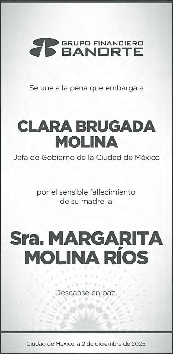 Año 42, número 14867, 2 de diciembre de 2025, La Jornada es una publicación diaria editada por DEMOS, Desarrollo de Medios, S.A. de C.V. con domicilio en Avenida Cuauhtémoc 1236, Colonia Santa Cruz Atoyac, Alcaldía Benito Juárez, C.P. 03310, Ciudad de México. Teléfonos 55 9183 0300 y 55 9183 0400. Página electrónica del periódico: http://www.jornada.com.mx y dirección electrónica: comentarios@jornada. com.mx. Editor Responsable María del Carmen Lira Saade, Directora General. Certificado de Reserva de Derechos al Uso Exclusivo del Título No. 04-1984-000000000571-101; ISSN 0188-2392, ambos otorgados por el Instituto Nacional del Derecho de Autor. Certificado de Licitud de Título número 2387 y Certificado de Licitud de Contenido número 1616, otorgados por la Comisión Calificadora de Publicaciones y Revistas Ilustradas de la Secretaría de Gobernación. Impresión: Imprenta de Medios, S.A. de C.V. con domicilio en Avenida Cuitláhuac 3353, colonia Ampliación Cosmopolita, Alcaldía Azcapotzalco, C.P. 02670, Ciudad de México, teléfonos 55 5355 6702 y 55 5355 7794, Fax: 55 5355 8573. Distribución: en el interior de la República y el extranjero por Distribuidora y Comercializadora de Medios, S.A. de C.V. CENTRAL DE SUSCRIPCIONES, con domicilio en Avenida Cuitláhuac 3353, colonia Ampliación Cosmopolita, Alcaldía Azcapotzalco, C.P. 02670, Ciudad de México, teléfonos 55 5541 7701 y 55 5541 7002. Distribuido en la Ciudad de México por la Unión de Expendedores y Voceadores de los Periódicos de México, A.C., con domicilio en calle Guerrero número 50, Colonia Guerrero, Alcaldía Cuauhtémoc, C.P. 06350, Ciudad de México, Teléfonos; 55 5591 1400 y 55 5535 1361. Este número se terminó de imprimir el 2 de diciembre de 2025, con un tiraje promedio de 146,429 ejemplares.