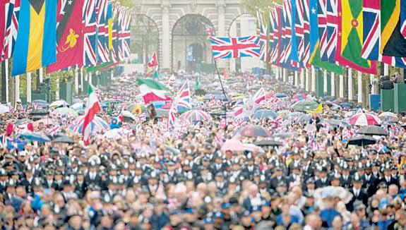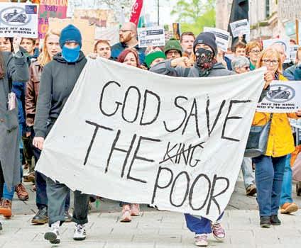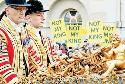 ▲ Opositores a la monarquía se manifestaron en la plaza Trafalgar mientras miles pernoctaron para ver el desfile. En la manta se lee: Dios salve a los pobres. Fotos Afp y Ap