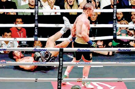 ▲ A pesar de que Saúl Álvarez le rompió la nariz desde el tercer round y lo mandó dos veces a la lona, John Ryder logró terminar, por la fuerza del orgullo, la pelea pactada a 12 episodios. Fotos Afp