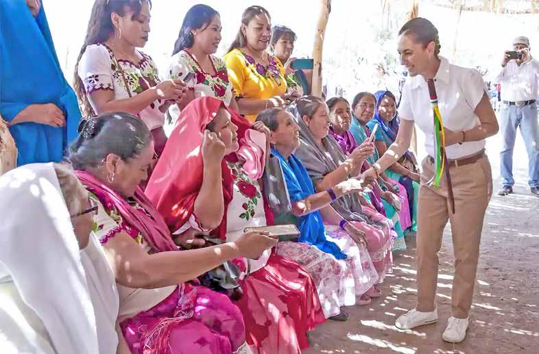 ▲ Claudia Sheinbaum, virtual presidenta electa, saluda a un grupo de mujeres yaquis luego de recibir el bastón de mando de los ocho gobernadores de la indómita etnia en la localidad de Vicam, Sonora. La ceremonia se realizó en la ancestral ramada, donde se efectúa la
