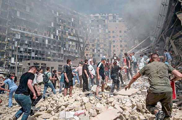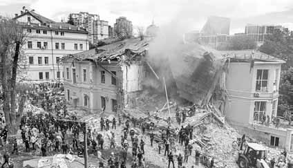 ▲ Habitantes de Kiev, la capital, y equipos de rescate intentan localizar a víctimas en un hospital pediátrico. Las autoridades de Ucrania aseguran que fue blanco de uno de los misiles lanzados ayer por Rusia, pero el Kremlin afirma que fue por cohete antiaéreo. En