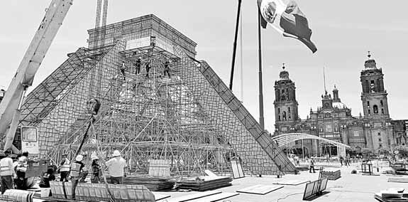 ▲ Trabajadores montan una copia del templo de Kukulkán, también conocido como El Castillo, en el Zócalo. Foto María Luisa Severiano