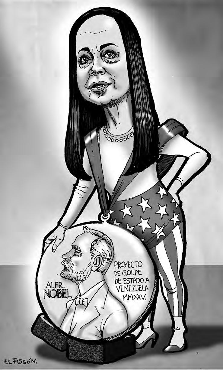 El otorgamiento del Premio Nobel de La Paz a María Corina Machado es un acto abominable que le da continuidad a entregas de dichos premios a personajes como Henry Kissinger (1973), Menájem Beguín (1978) y Barack Obama (2009). María Corina Machado es representante de la extrema derecha de carácter neofascista que hoy avanza en el mundo. Ultraneoliberal, anticomunista y partidaria de la intervención militar estadunidense en Venezuela, no ha escatimado esfuerzos en solicitarla. En 2018 la pidió en una carta a Mauricio Macri y Benjamin Netanyahu; en 2019, lo hizo a la Asamblea Nacional de Venezuela, entonces con mayoría antichavista. En estos momentos de la avanzada naval estadunidense ha justificado diciendo que estas movilizaciones militares estadunidenses no están dirigidas contra el pueblo venezolano, sino contra lo que ella llama una “estructura de narcotráfico”, el inventado cártel de Los Soles, supuestamente dirigido por el presidente Nicolás Maduro. Por lo demás son conocidos los