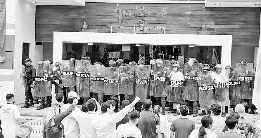 detenidos. En Yucatán, los manifestantes irrumpieron en el recinto e incluso bajaron hasta las curules de los diputados, mientras en Puebla (en la imagen) patearon las puertas y las golpearon con palos, pero no lograron ingresar al lugar de la sesión. Foto Es Imagen