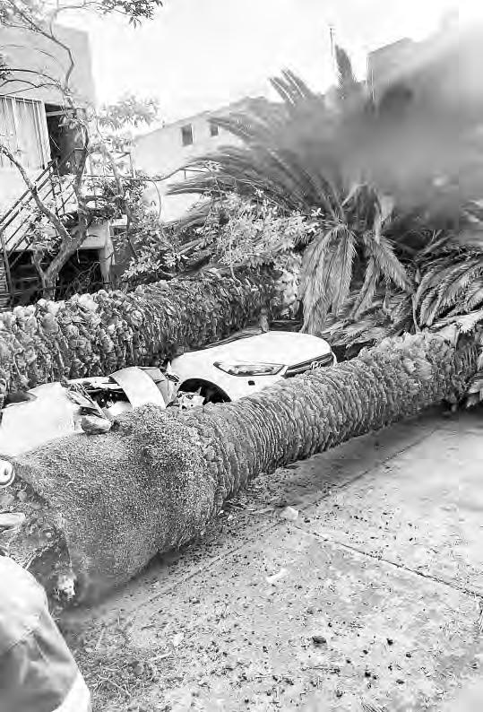▲ Dos palmeras cayeron sobre cuatro vehículos en Oriente 257 y Sur 8, colonia Agrícola Oriental, que además dañaron dos postes del tendido eléctrico y telefónico, aunque no se reportaron personas lesionadas. Foto cortesía de los bomberos