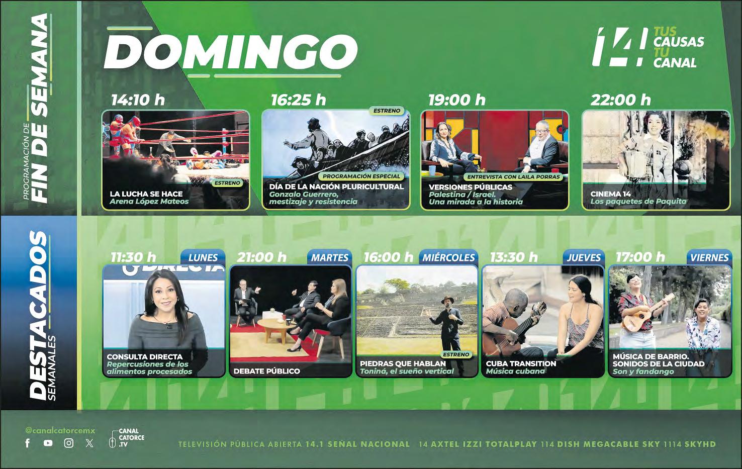 Año 42, número 14816, 12 de octubre de 2025, La Jornada es una publicación diaria editada por DEMOS, Desarrollo de Medios, S.A. de C.V. con domicilio en Avenida Cuauhtémoc 1236, Colonia Santa Cruz Atoyac, Alcaldía Benito Juárez, C.P. 03310, Ciudad de México. Teléfonos 55 9183 0300 y 55 9183 0400. Página electrónica del periódico: http:// www.jornada.com.mx y dirección electrónica: comentarios@jornada. com.mx. Editor Responsable María del Carmen Lira Saade, Directora General. Certificado de Reserva de Derechos al Uso Exclusivo del Título No. 04-1984-000000000571-101; ISSN 0188-2392, ambos otorgados por el Instituto Nacional del Derecho de Autor. Certificado de Licitud de Título número 2387 y Certificado de Licitud de Contenido número 1616, otorgados por la Comisión Calificadora de Publicaciones y Revistas Ilustradas de la Secretaría de Gobernación. Impresión: Imprenta de Medios, S.A. de C.V. con domicilio en Avenida Cuitláhuac 3353, colonia Ampliación Cosmopolita, Alcaldía Azcapotzalco, C.P. 02670, Ciudad de México, teléfonos 55 5355 6702 y 55 5355 7794, Fax: 55 5355 8573. Distribución: en el interior de la República y el extranjero por Distribuidora y Comercializadora de Medios, S.A. de C.V. CENTRAL DE SUSCRIPCIONES, con domicilio en Avenida Cuitláhuac 3353, colonia Ampliación Cosmopolita, Alcaldía Azcapotzalco, C.P. 02670, Ciudad de México, teléfonos 55 5541 7701 y 55 5541 7002. Distribuido en la Ciudad de México por la Unión de Expendedores y Voceadores de los Periódicos de México, A.C., con domicilio en calle Guerrero número 50, Colonia Guerrero, Alcaldía Cuauhtémoc, C.P. 06350, Ciudad de México, Teléfonos; 55 5591 1400 y 55 5535 1361. Este número se terminó de imprimir el 12 de octubre de 2025, con un tiraje promedio de 146,429 ejemplares.