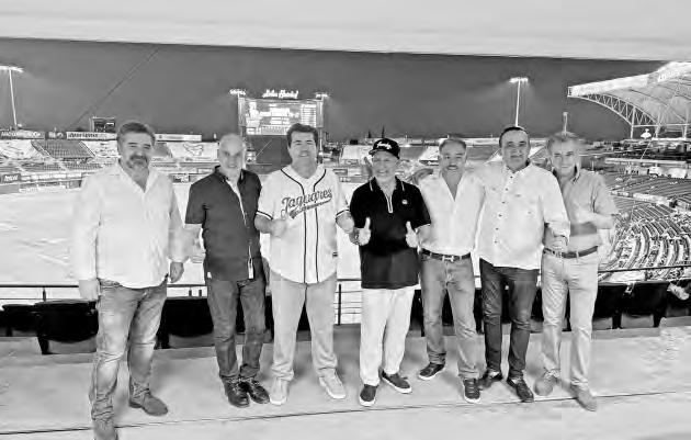 ▲ Durante un partido de beisbol en Mazatlán, Sinaloa, el diputado morenista Pedro Haces (con el jersey del equipo Jaguares) estuvo acompañado de Manuel Bribiesca (quinto de izquierda a derecha), hijo de la ex primera dama