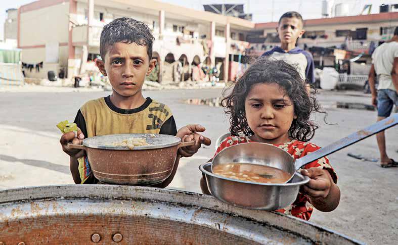 la onu y organizaciones internacionales, informaron fuentes militares. las protestas contra la gestión del mandatario continuaron con bloqueos en carreteras. en la imagen, dos niños palestinos reciben alimentos en la ciudad de jan Yunis. Foto Xinhua. agencias / P 29