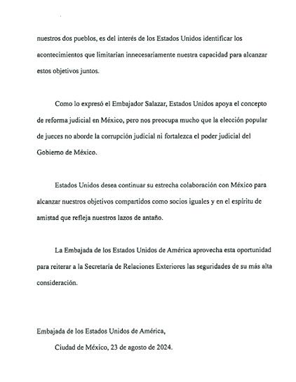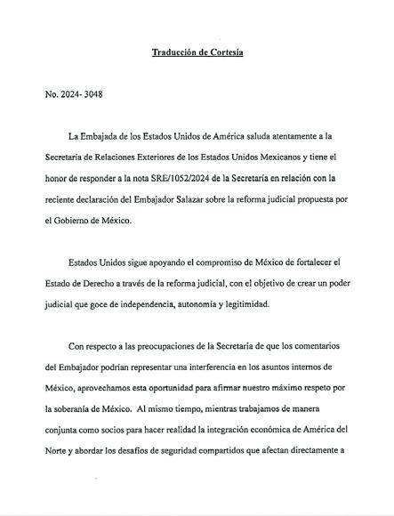 l embajador Ken alazar reveló la respuesta a la nota diplomática que la SRE le envió la semana pasada por sus declaraciones respecto de la reforma judicial.