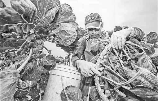 ETrabajador agrícola cultivando coles de Bruselas, a estos trabajadores se les paga de acuerdo a la cantidad de coles que cosechan, Watsonville, CA, USA, 2016. Foto: David