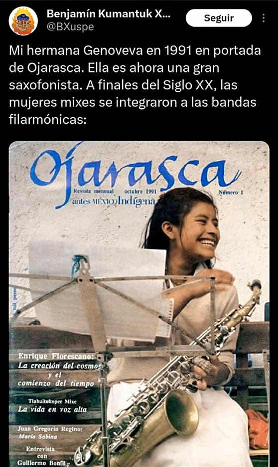 Inmediatamente, en octubre de 1991, el proyecto continuó como Ojarasca. La memorable portada del primer número retrataba a Genoveva, joven estudiante del conservatorio indígena fundado desde 1977 en Tlahuitoltepec Mixe, Oaxaca: el Centro de Capacitación Musical y Desarrollo de la Cultura Mixe (CECAM), que pronto tuvo alcance nacional. En la foto de Mariana Rosenberg, la chica empuña alegremente un saxofón. Recientemente, el compositor e instrumentista ayuuk (mixe) Benjamín Kumantuk Xuxpë revivió aquella portada en su página de Facebook, celebrando a su hermana Genoveva, quien ha llegado a ser una gran saxofonista.