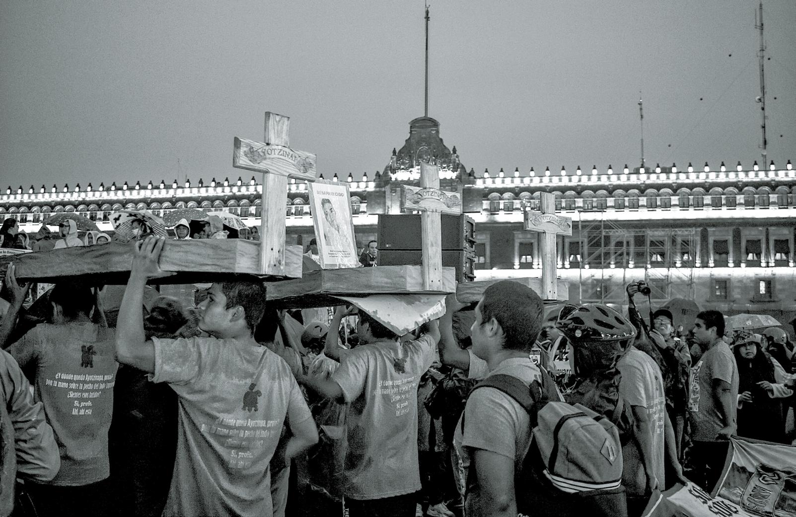 La tarde lluviosa del pasado 26 de septiembre la multitudinaria marcha avanzó por avenida Reforma desde el Ángel de la Independencia. Se detuvo frente al enorme +43 de acero pintado de rojo y ahí, de manera intempestiva, activistas instalaron un memorial con las fotos de cada uno de los futuros maestros desaparecidos. “A 10 años de los hechos nuestra demanda es inclaudicable, por lo que al gobierno le exigimos la presentación con vida de nuestros hijos”, dicen los padres durante la instalación. Es la década sin respuestas lo que los sigue movilizando.