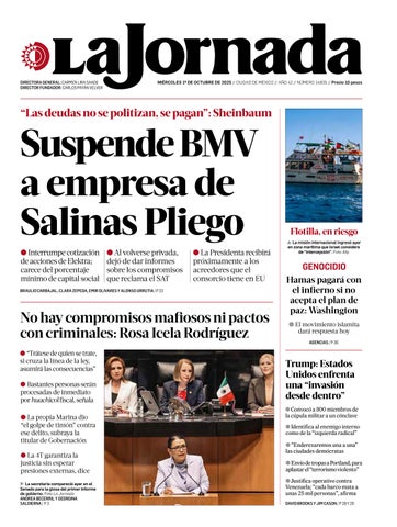 La Jornada Semanal, suplemento semanal del periódico La Jornada. Editor responsable: Luis Antonio Tovar Soria. Reserva al uso exclusivo del título La Jornada Semanal núm. 04-2008121817375200-107, del 18/XII/2008, otorgada por el Instituto Nacional del Derecho de Autor. Licitud de título 03568 del 28/ XI/23 y de contenido 03868 del 28/XI/23, otorgados por la Comisión Calificadora de Publicaciones y Revistas Ilustradas de la Secretaría de Gobernación. Editado por Demos, Desarrollo de Medios, SA de CV; Av. Cuauhtémoc 1236, colonia Santa Cruz Atoyac, CP 03310, Alcaldía Benito Juárez, Ciudad de México, tel. 55-9183-0300. Impreso por Imprenta de Medios, SA de CV, Av. Cuitláhuac 3353, colonia Ampliación Cosmopolita, Azcapotzalco, CP 02670, Ciudad de México, tels. 555355-6702 y 55-5355-7794. Distribuido por Distribuidora y Comercializadora de Medios, SA de CV, Av. Cuitláhuac 3353, colonia Ampliación Cosmopolita, Azcapotzalco, CP 02670, Ciudad de México, tels. 55-5541-7701 y 55-5541-7702. Prohibida la reproducción parcial o total del contenido de esta publicación por cualquier medio, sin permiso expreso de los editores. La redacción no responde por originales no solicitados ni sostiene correspondencia al respecto. Toda colaboración es responsabilidad de su autor. Títulos y subtítulos de la redacción.