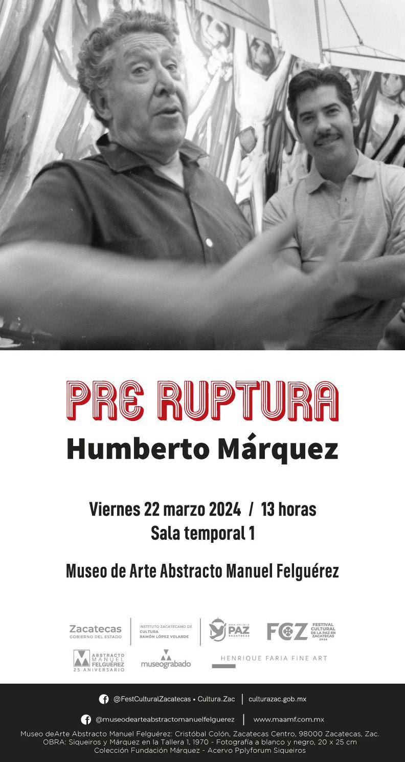 PreRuptura, de Humberto Márquez, se inaugura el viernes 22 de marzo, en la Sala Temporal 1 del Museo de Arte Abstracto Manuel Felguérez, a las 13:00 horas, como parte de las actividades programadas en el Festival Cultural Zacatecas