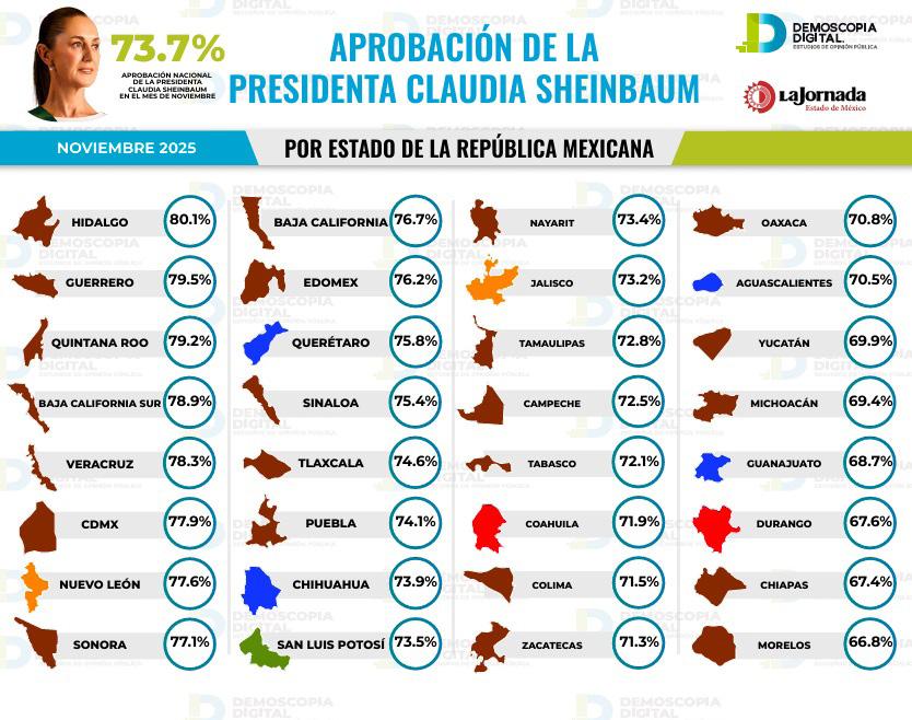 la presidenta Claudia Sheinbaum Pardo logró una aprobación ciudadana del 73.7 por ciento – cinco puntos porcentuales menos que en el mes de octubre, donde logró 79.2%-, con una desaprobación de únicamente 11.4%, 6.7% que se mantienen al margen, no aprueban ni desaprueban y el restante 8.2% no otorgó respuesta alguna. Destaca que la aprobación nacional de la presidenta ha rondado arriba del 70% durante su primer año de gobierno, y durante el mes de noviembre, fue en Hidalgo donde obtuvo el mayor apoyo con un 80.1% de ciudadanos que la respaldan,