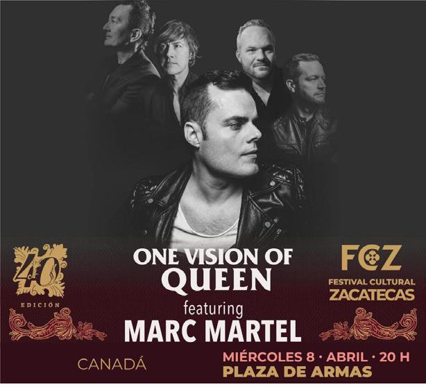 La magia de la banda británica Queen hará vibrar el escenario de la Plaza de Armas, en la edición 40 del Festival Cultural Zacatecas el miércoles 8 de abril, cuando el canadiense Marc Martel, reconocido por ser el doble vocal más destacado de Freddie Mercury en el mundo, se presente ante el público zacatecano.