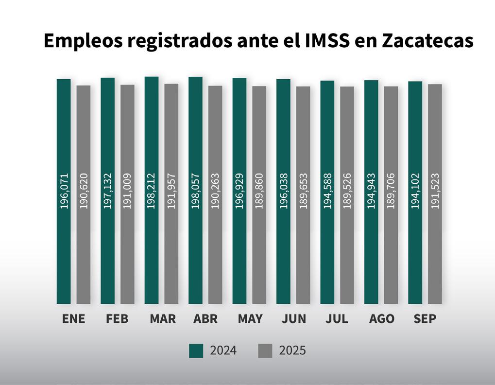 En septiembre del 2025, Zacatecas registró un incremento de mil 817 puestos de trabajo afiliados al Instituto Mexicano del Seguro Social (IMSS) en relación con el mes anterior; sin embargo, en comparación con el mismo mes, pero del año anterior (variación anual), hay una disminución de 2 mil 579 puestos.