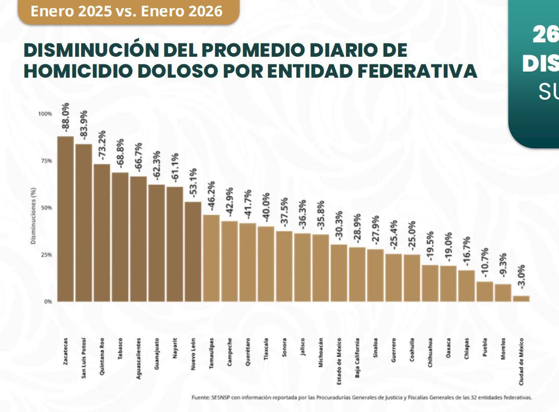 En La Mañanera del Pueblo, se destacó a Zacatecas como ejemplo nacional al lograr una disminución histórica del 88 por ciento en su promedio diario de homicidios dolosos en enero de 2026, en comparación con enero de 2025, además de ser el estado con el menor número de víctimas registradas durante el mes, con tres. Según cifras históricas, desde junio de 2014, el estado de Zacatecas no registraba tres víctimas de homicidio doloso o menos en un mes, lo que convierte al mes de enero de 2026 en el más bajo desde entonces. Foto: Cortesía