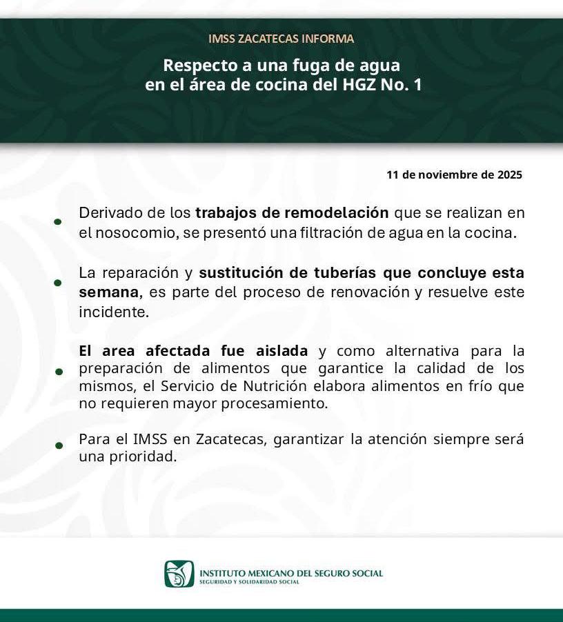 ▲ El IMSS Zacatecas informó que una fuga de agua registrada en el área de cocina del Hospital General de Zona No. 1 fue controlada oportunamente y no afectó la preparación ni el suministro de alimentos para los pacientes. De acuerdo con la institución, el incidente ocurrió como parte de los trabajos de remodelación que se realizan en el nosocomio, y se debió a una filtración derivada del proceso de sustitución de tuberías. El área afectada fue aislada de manera preventiva y, como medida temporal, el servicio de nutrición implementó la elaboración de alimentos en frío, garantizando en todo momento la calidad e inocuidad de las comidas. Foto: Cortesía