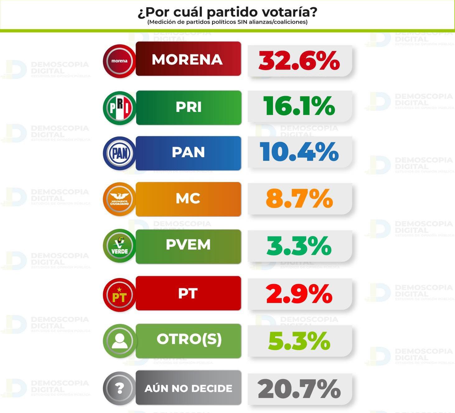 ● Actualmente, 32.6% de ciudadanos votarían por el partido: Demoscopia Digital.