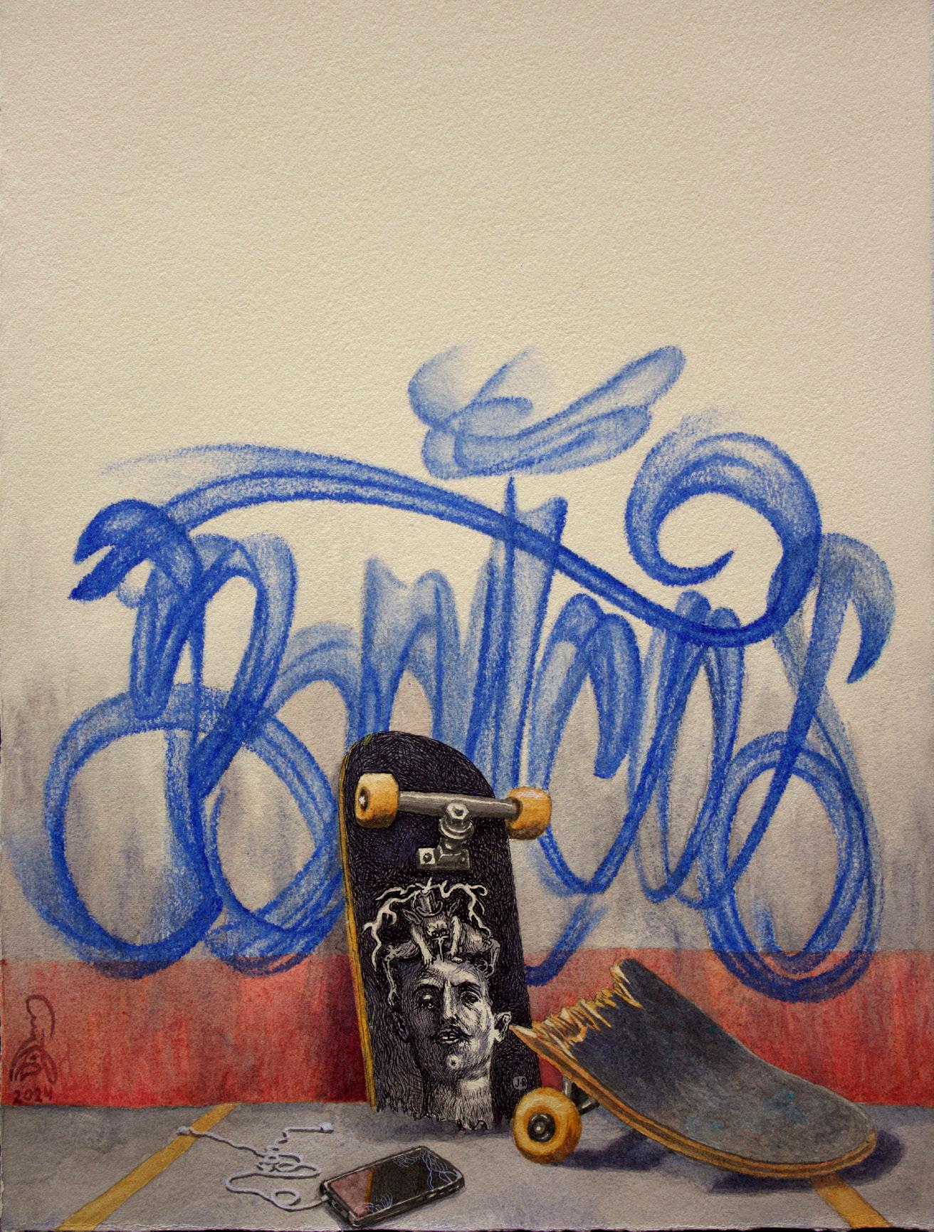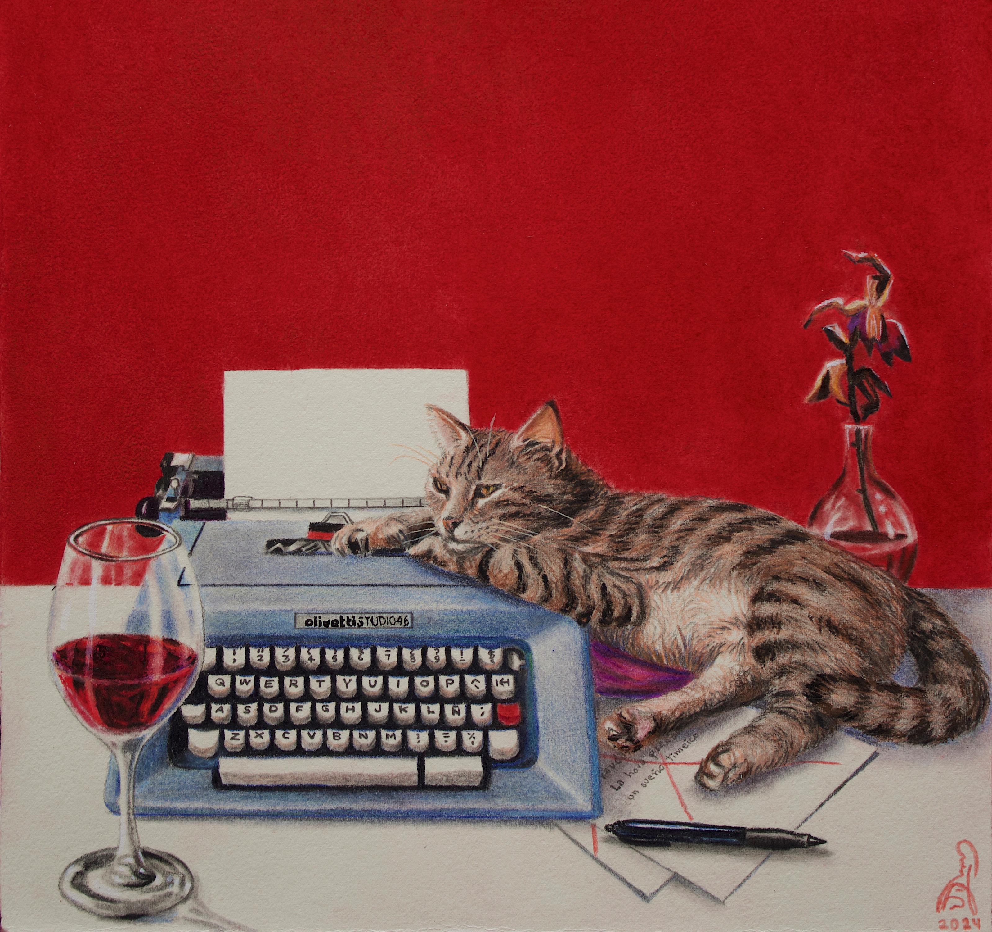 Vinotinta. Dibujo de Juan Carlos Villegas de la exposición ¿Sienten nostalgia los muertos?, 2024.