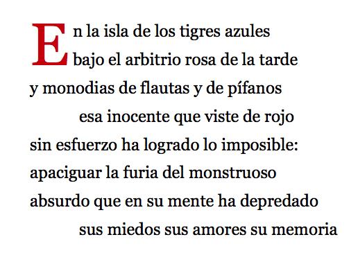 Con música y danza tres gatos hacen la ronda a un árbol de cabezas; antes fueron escarabajos. Y eso de ahí es un ojo que llora ríos de horas, hasta que entra en la forma, hasta que escrita en el lienzo florece como prado de llaves de acero.