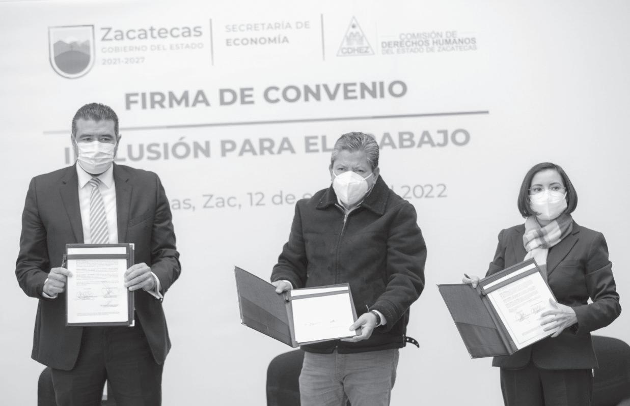 de apostarle a la política social, pero también a la de la formación y capacitación porque la población con alguna discapacidad tiene la necesidad y el interés de integrarse al ámbito laboral. En su oportunidad, el secretario de Economía, Rodrigo Castañeda, dijo que para la nueva gobernanza es primordial garantizar la inclusión laboral de todas y todos los zacatecanos, por lo que la encomienda del gobernador es trabajar para garantizar el derecho al trabajo que tienen todas las personas, de ahí la importancia del convenio que coadyuvará a romper las barreras para lograrlo, y en ese sentido, la dependencia a su cargo, enfatizó, reforzará el trabajo para garantizar el bienestar de las familias. Cabe señalar que, para atender las medidas de salud, de manera virtual también participaron en el evento 40 representantes de asociaciones civiles y más de 20 empresas. De manera presencial asistieron Claudia Núñez de la asociación Sin discriminación, un mundo mejor; y los presidentes de la Canacintra, Coparmex, Canacozac y Canirac, Sara Hernández, Antonio Sánchez, Francisco Flores y Carlos de la Torre, respectivamente.