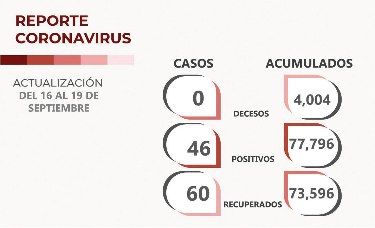 La Secretaría de Salud de Zacate cas (SSZ) no registró decesos por Covid-19, en el periodo del 16 al 19 de septiembre; reportó a 60 personas recuperadas del virus, así como 46 nuevos casos positivos.