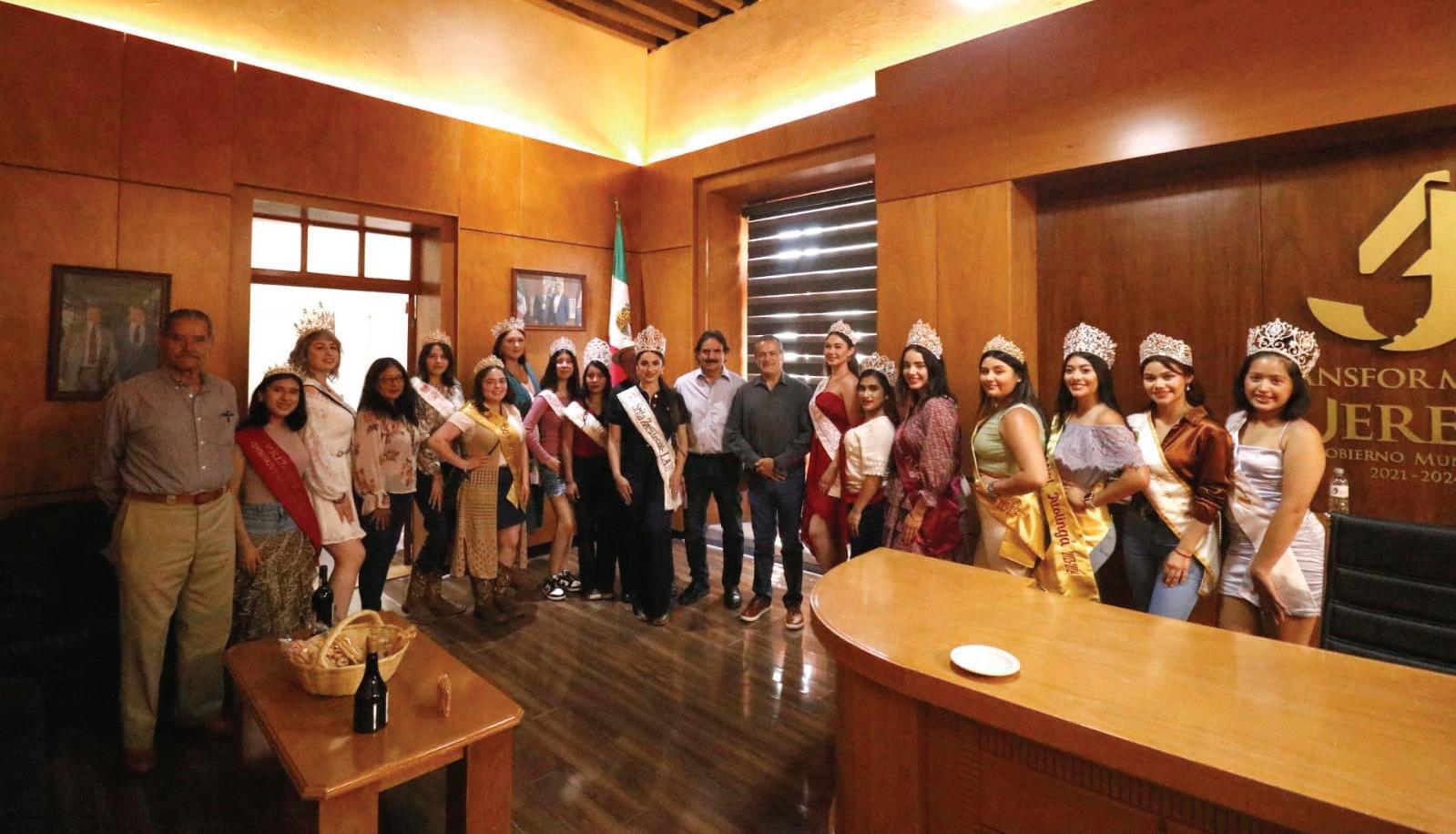 JEREZ. El presidente municipal, José Humberto Salazar Contreras, dio la bienvenida a las representantes de la belleza de los clubes zacatecanos de Estados Unidos que se encuentran en esta tierra, en el marco de un viaje de tipo cultural y reencuentro con sus raíces. Durante su estancia, recorren parte de la entidad y este viernes estuvieron en Jerez, donde la autoridad municipal aseguró que, con el título que ostentan, son dignas embajadoras de todo México.