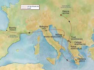 TOUR HIGHLIGHTS: September 7 – 21, 2023 Cost per person $136,500 Single accommodations supplement $13,500 Limited to maximum 15 travelers Suite Accommodations Throughout ENTICING EUROPE BY PRIVATE JET AIRCRAFT Challenger 850 or comparable Aircraft and seating configuration subject to change FLIGHT ITINERARY Vienna/Tivat 1:25 hrs Tivat/Olympia 1:10 hrs Olympia/Mostar 1:25 hrs Mostar/Bologna 1:15 hrs Bologna/Biarritz 1:55 hrs Call your travel professional or Lakani at (888) 565-5554