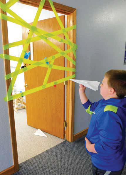 Alternate version: Fold paper airplanes. Aim planes at non-sticky side and try to get planes through the maze of openings.