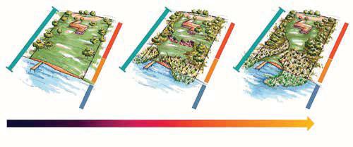 Although natural shoreline landscape designs reduce the areas without natural vegetation, they still include open areas, as well as access to the lake for recreation.