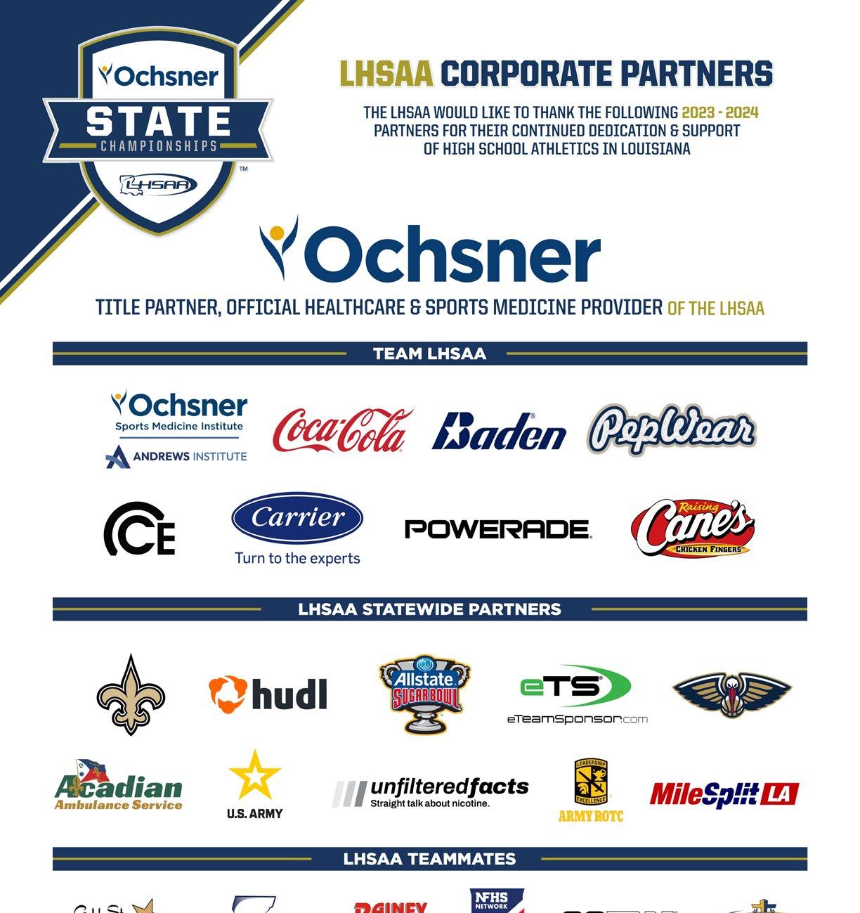 We would like to thank our corporate partners, our host site, their communities, and the many volunteers who without their dedication and support these championships would not be possible. Without our corporate partner support and dedication to high school sports, we could not provide our athletes with premier facilities.