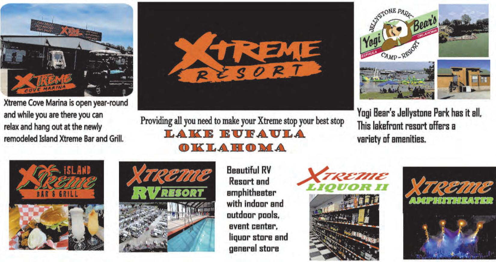 Make Xtreme Resort your vacation destination and find your new favorite place on Lake Eufaula. Located on Lakeshore Dr. in Eufaula, Oklahoma, you will find the Xtreme Resort which consists of Xtreme RV Park, Xtreme Condominiums, Xtreme Amphitheater, Xtreme Cove Marina, Island Xtreme Bar and Grill, Xtreme General Store, Xtreme Liquor Store II, Yogi Bear’s Jelly Stone Park and so much more. Sure to create memories that will last a lifetime. If you do not have an RV, no problem. The Xtreme condominiums are perfect for family, friends and couples’ weekend or weeklong getaways. Located in the city of Eufaula these beautiful Condominiums are fully furnished, they sleep four and include Wi-Fi, big screen TV, fully equipped kitchen, outdoor gill and so much more. Check them out on Facebook at Xtreme RV Resort, or on the web site. www. xtremeresortok.com. At Xtreme Resort you are within