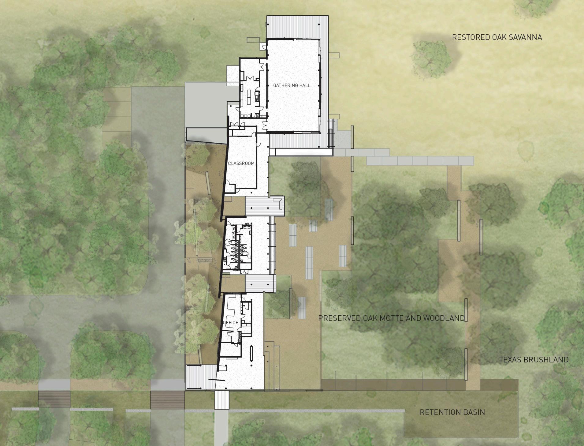 Hardberger Park is a 311-acre park located within the urban reaches of San Antonio focused on retaining a rich and diverse array of ecosystems. The Urban Ecology Center includes a visitor center that emphasizes the dynamic interaction between natural and urban systems, thereby educating and fostering the stewardship of the natural and cultural landscape. The complex consists of a series of pavilions housing programs including offices, restrooms and classrooms. These structures frame outdoor rooms of various scales that allow people to interact with the natural environment in contrasting ways, and demonstrate how buildings and people can develop a symbiotic relationship with the native landscape.