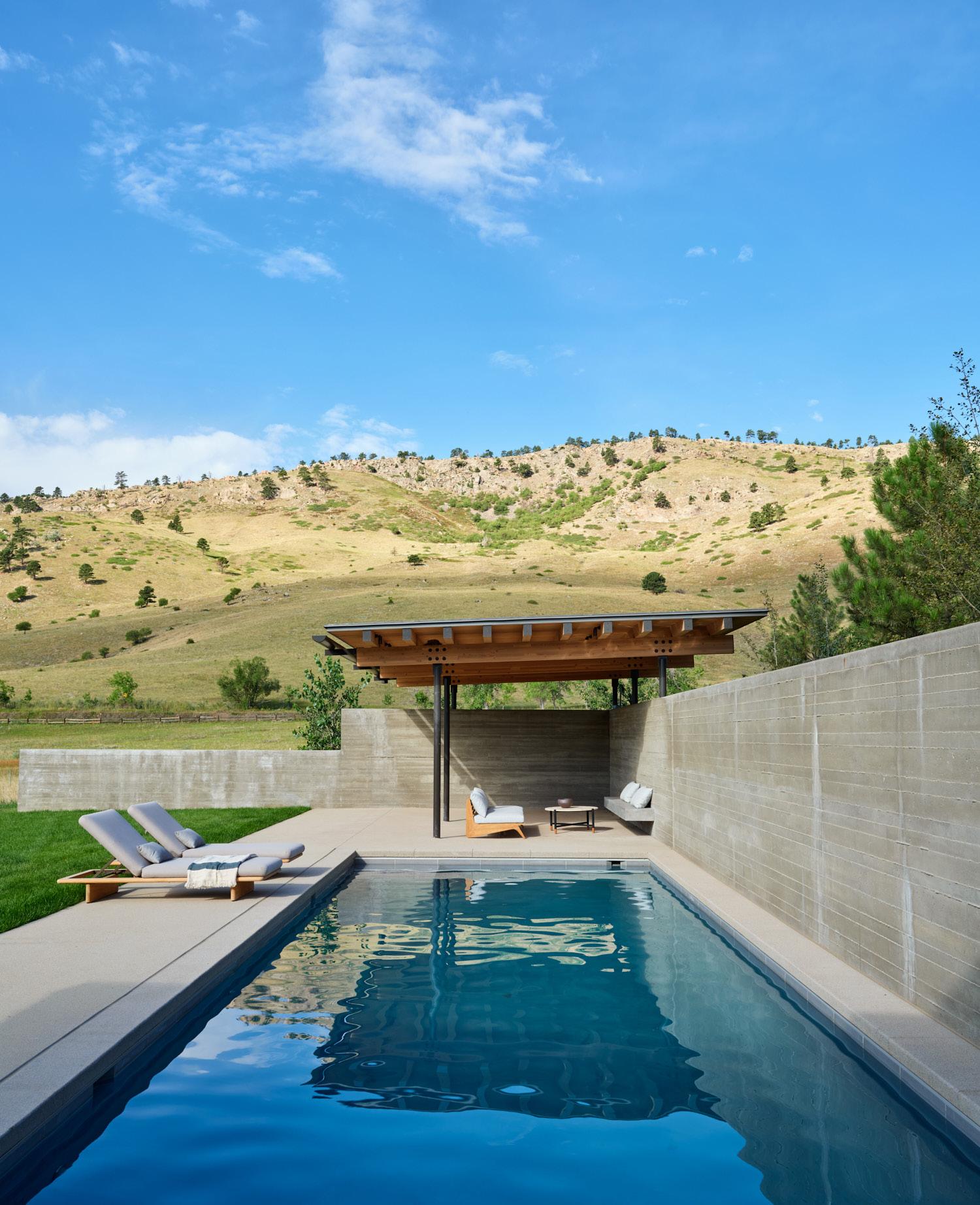 The house finds inspiration from two regional building types - the simple gabled barn and the earthen sodbuster home of the early settlers. To take advantage of the site’s more temperate summer climate, the main barn-like living space can open to the site with a series of large sliding doors that wrap the building.