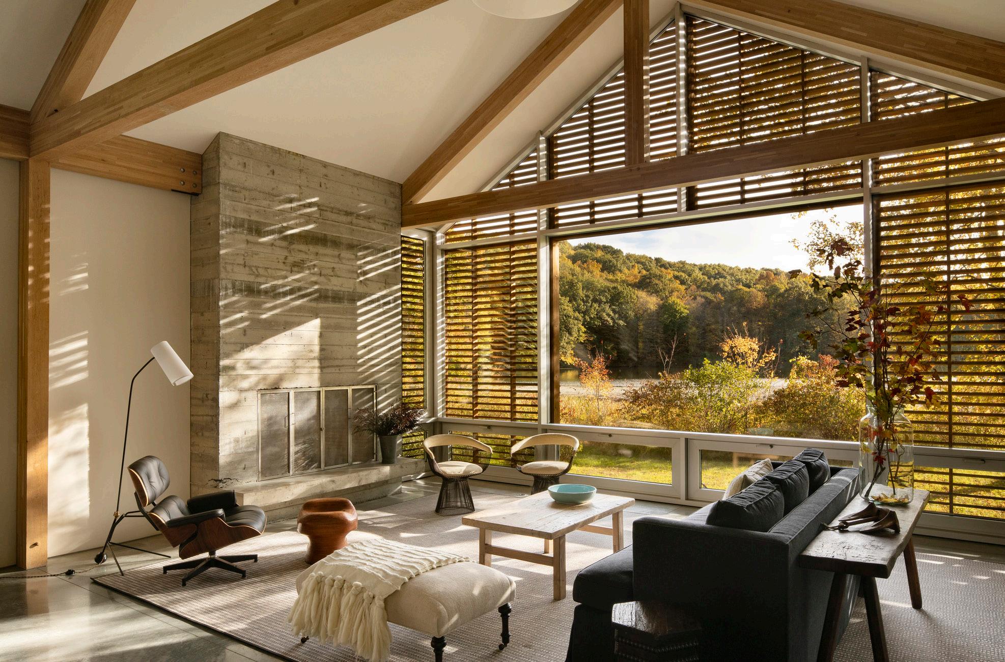 Prefabrication played a major role in the design and construction process. The house was designed and produced in close collaboration between architect, factory, and contractor. The exposed heavy timber frame and superinsulated wall panels were prefabricated in a climate-controlled facility nearby and delivered to the site for assembly. Off-site fabrication made possible an aggressive eight-month construction schedule in the middle of the New York winter. The precision of the prefabricated components also provided a very tight building envelope resulting in higher energy performance and precise control over indoor air quality.