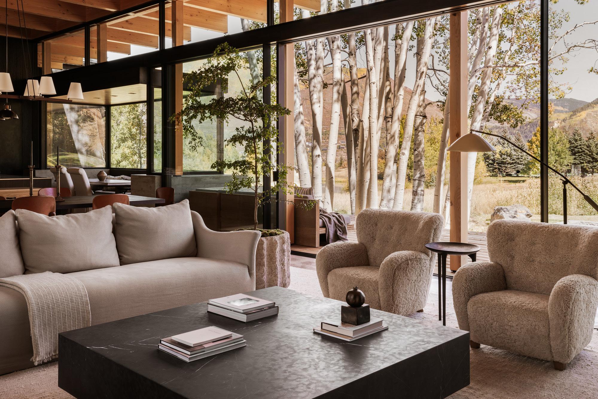 Focused on the pedestrian experience, the project features a modern rustic design and a landscape that unites the site with pathways, meadow landscapes, and groves of aspen trees.