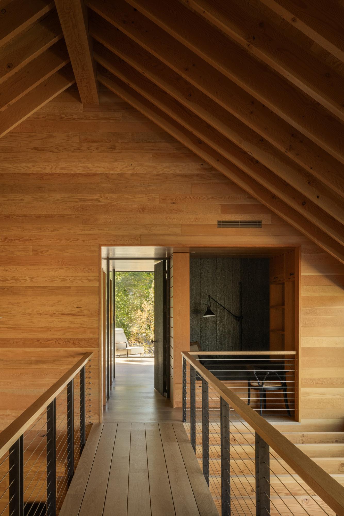 The slender gable of the main house steps down with the land, maintaining the building’s low-slung form. The double-height great room bridges two landscapes: a domesticated “beer garden” court with trees and the promontory experience looking out over the water. A second barn engaged in the knoll contains a garage, exercise space, and studio loft above with forest and ravine views. An existing carriage house, used for a long time as a guest cabin and renovated for this project, nestles into the other side of the knoll.